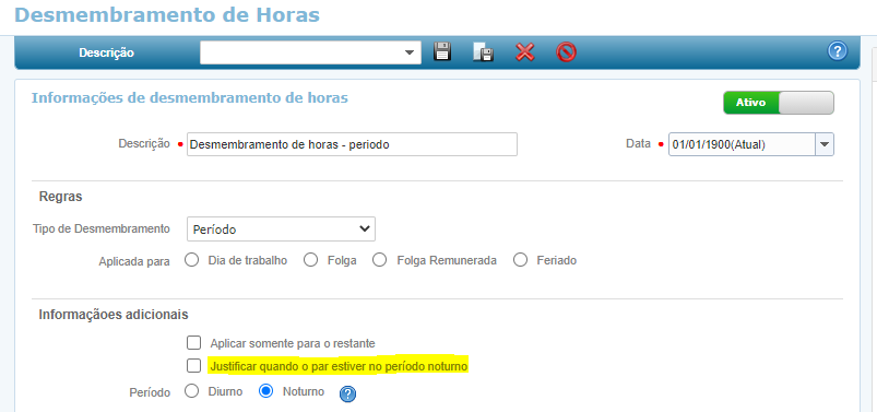 Implementado novo campo na funcionalidade Desmembramento de horas denominado Justificar quando o par estiver no período noturno. Esta opção só estará disponível quando selecionar as opções Tipo de desmembramento período e Período Noturno.