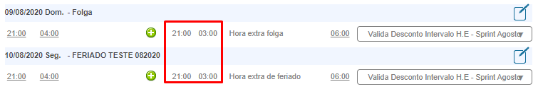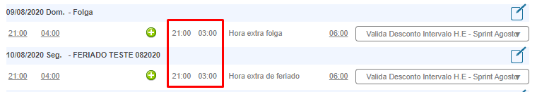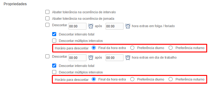 Foram desenvolvidas novas opções na parametrização do desconto do intervalo de horas extras para definir como será aplicado esse desconto em relação à ocorrência: Final da hora extra (opção default – é como é feito atualmente), Preferência diurno ou Preferência noturno. Estas opções estão disponiveis tanto para o desconto do intervalo para Hora Extra de Folga/Feriado quanto para a de Dia de Trabalho.