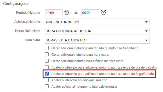 Criado nova opção na parametrização de Adicional Noturno para habilitar ou não o desconto do intervalo no adicional noturno de horas extras de folga e feriado, chamado: Abater o intervalo para adicional noturno na hora extra.