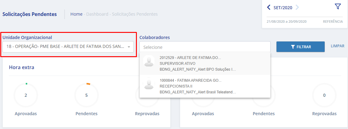 Foi desenvolvido um novo filtro no Autoatendimento para que o usuário consiga visualizar as solicitações pendentes e aprovadas por unidade(s) organizacional ou colaborador(es). Segue abaixo filtros de exemplo: