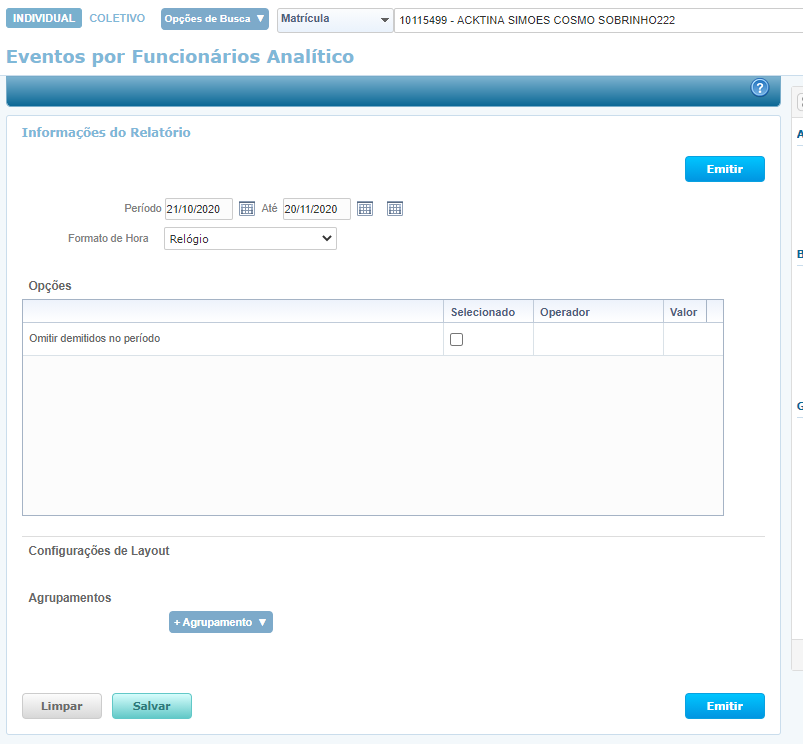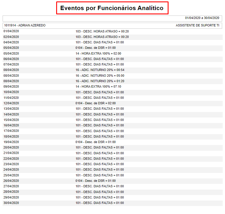 Foi desenvolvido um novo relatório chamado Eventos Por Funcionários Analítico, onde permite o usuários visualizar os eventos do funcionário por dia, ou seja, será possível visualizar os eventos gerados por dia.