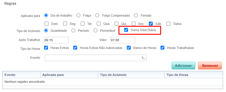 Foi desenvolvido nova rotina no cálculo de eventos e Consolidação que permite gerar o evento adicional por quantidade, somando todos os tipos de jornada do dia (hora extra, banco de horas, horas não autorizadas e horas trabalhadas).