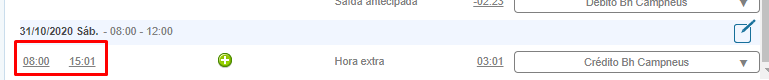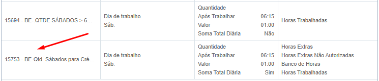 Supondo que o evento só deve ser gerado após 06h15 de trabalho somando horas trabalhadas normais, extras, não autorizadas e crédito de banco de horas no sábado e as seguintes quantidades de horas de trabalho realizadas: