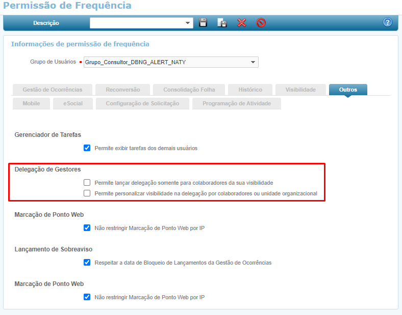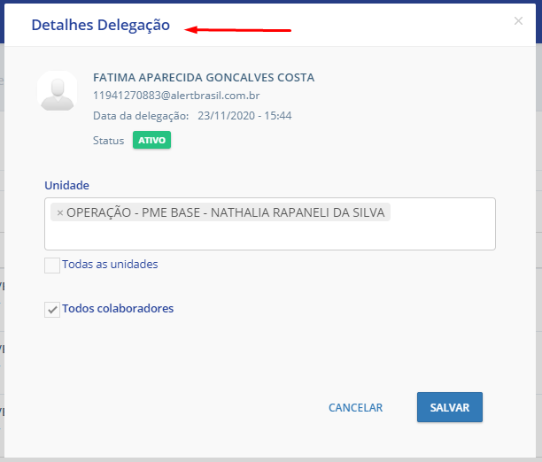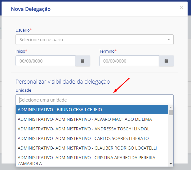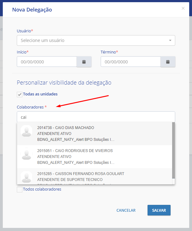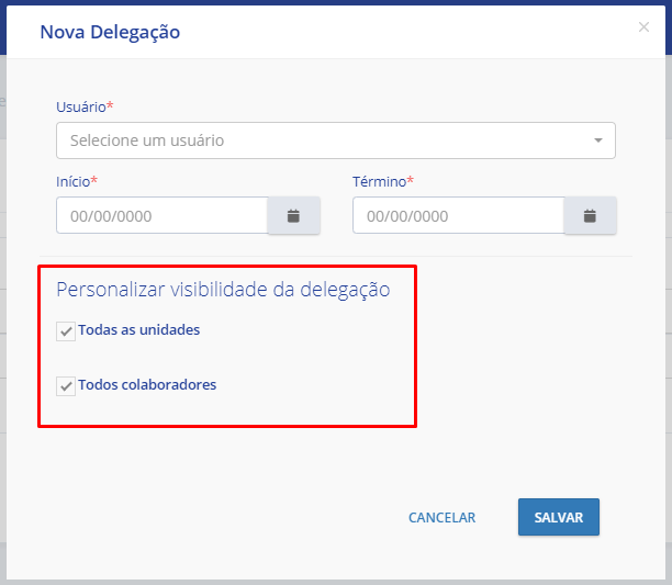 Foi feito uma customização para alterar a tela de delegação de gestores, para permitir personalizar a visibilidade a ser concedida na delegação sendo por colaboradores ou Unidade Organizacional específica.