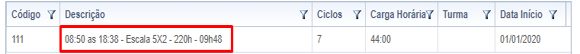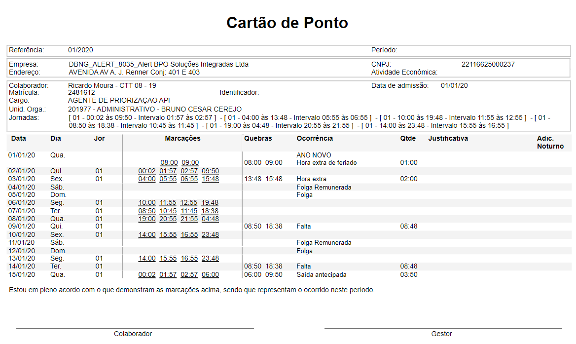 Temos o horário de trabalho das 08:50 às 18:38 com um intervalo de 01h, ou seja, tem uma carga horário prevista de 08:48.