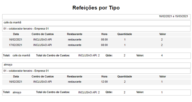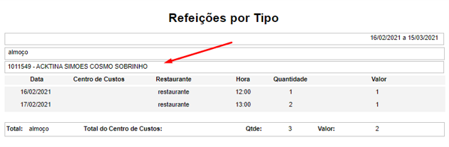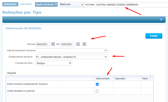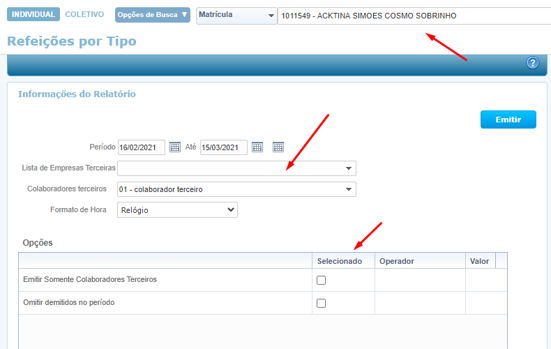 Foi desenvolvido duas novas opções na emissão do relatório Refeições por Tipo para seleção do colaborador terceiro no momento de emitir o relatório.