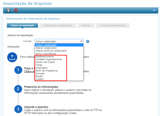 Foi desenvolvido novos conceitos para importação de arquivos, sendo eles: Estabelecimento; Unidade Organizacional; Centro de Custos; Cargo; Calendário; Perfil de Frequência; Jornada; Escala e Coletor.