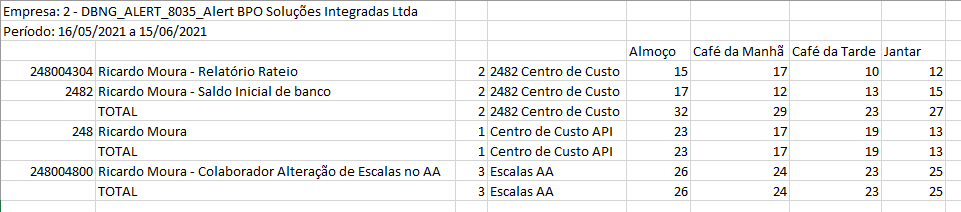 Exemplo do Relatório Rateio de Refeições - Excel: