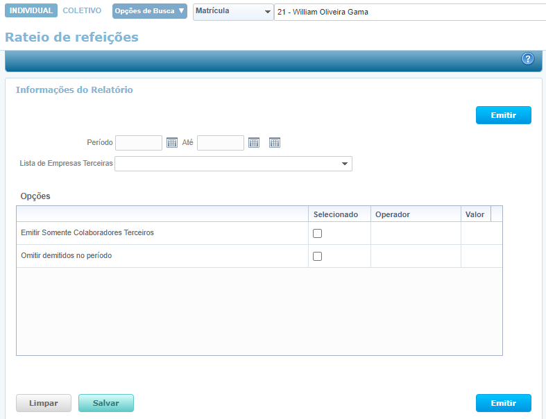 Foi desenvolvido um novo relatório Rateio de Refeições que apura a quantidade de cada tipo de refeição que cada funcionário consumiu. Será exibido também um total de refeições por centro de custo.