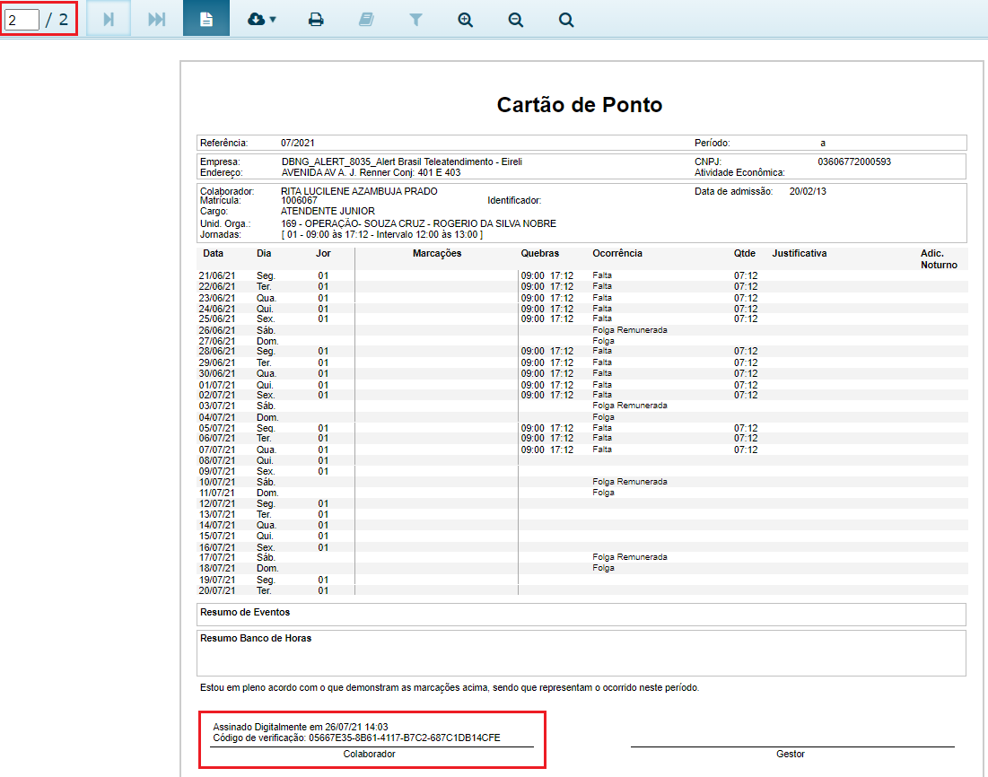 Exemplo Cartão de Ponto 1 - Colaborador 2 (modo coletivo):