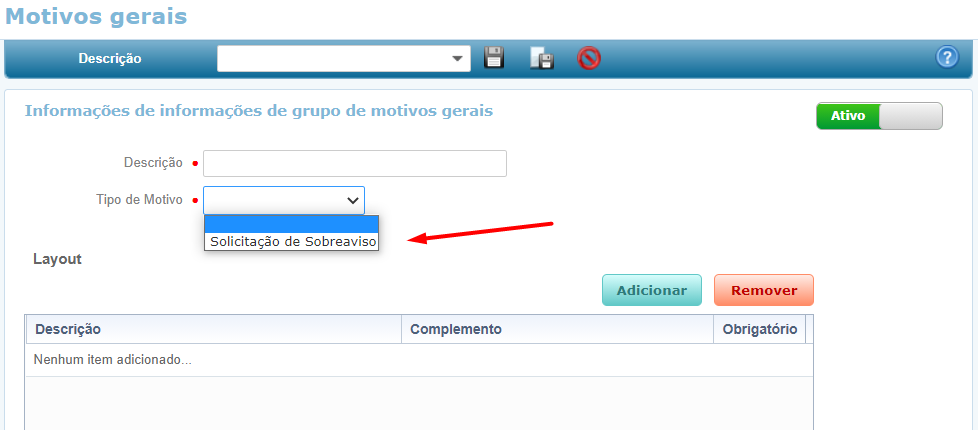 Opção Sobreaviso no Cadastro dos Motivos Gerais: