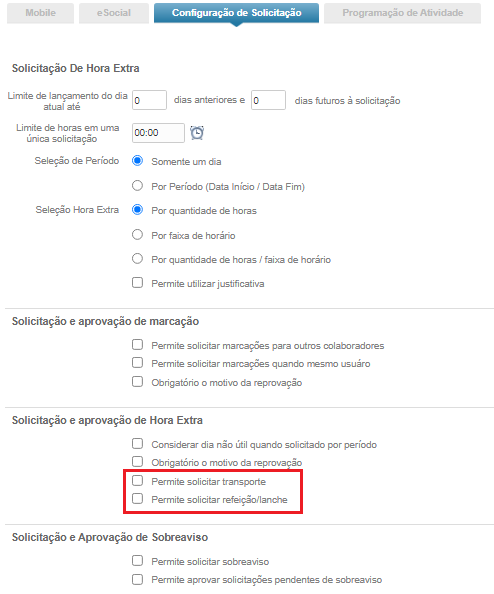 Foi desenvolvido um novo recurso que permite o usuário solicitar transporte e/ou refeição/lanche no autoatendimento dentro da solicitação de horas extras.