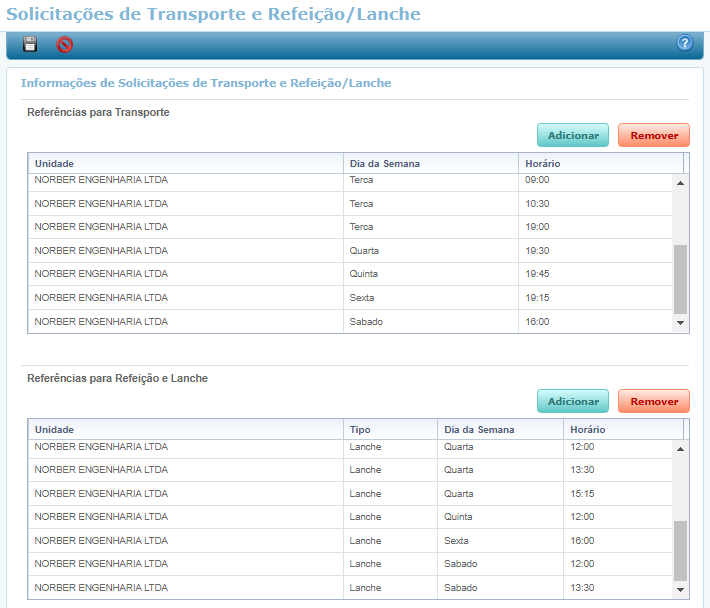 Nova tela para cadastro dos horários de Transporte e Refeição: