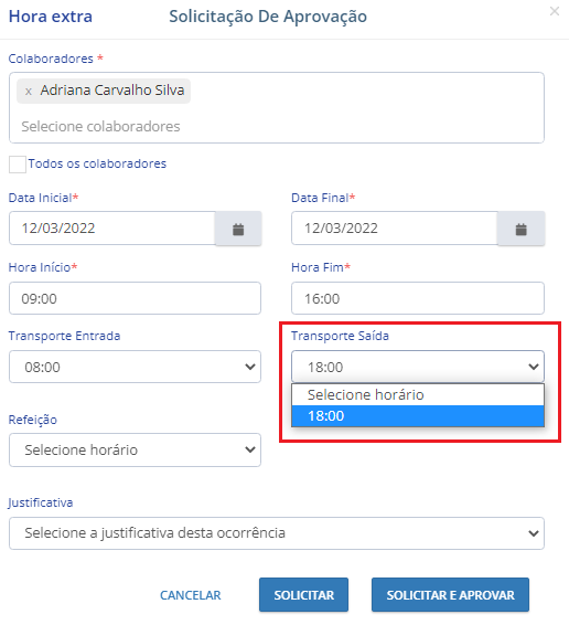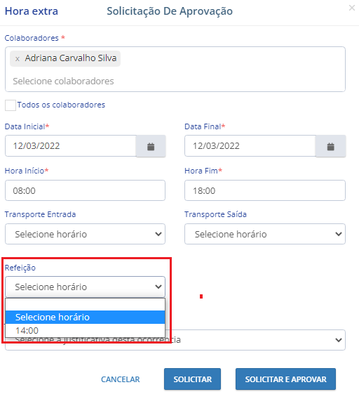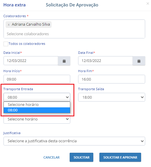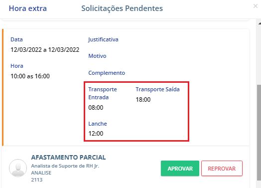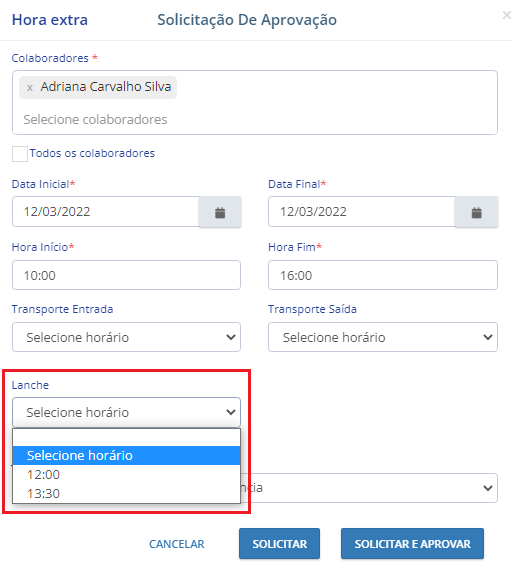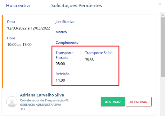 Esta implementação consiste em permitir que o solicitante envie, juntamente com a solicitação da aprovação de horas extras, a solicitação de transporte e/ou refeição/lanche para a utilização nesta necessidade.
