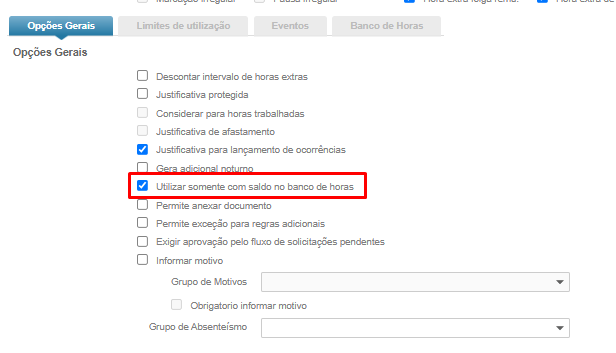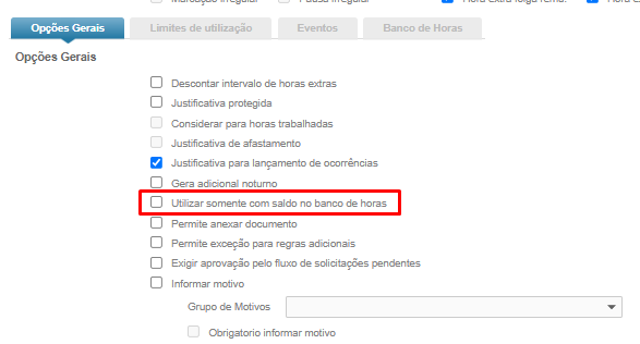 Foi implementado um novo parâmetro no cadastro de Justificativas para não permitir utilizar a justificativa quando não houver saldo de banco de horas a qual a justificativa está relacionada, ou seja, será possível utilizar a justificativa quando existir saldo suficiente no banco. Essa regra será para horas de crédito e débito.