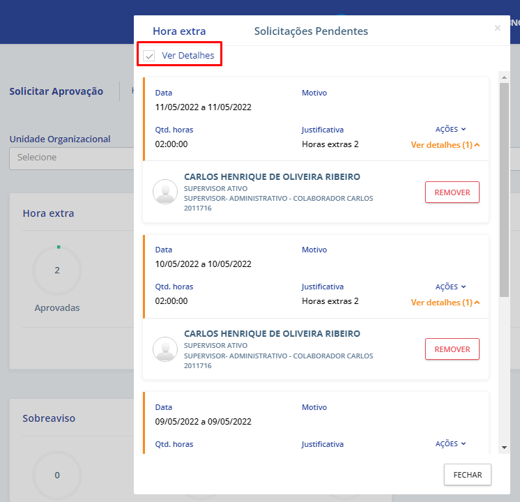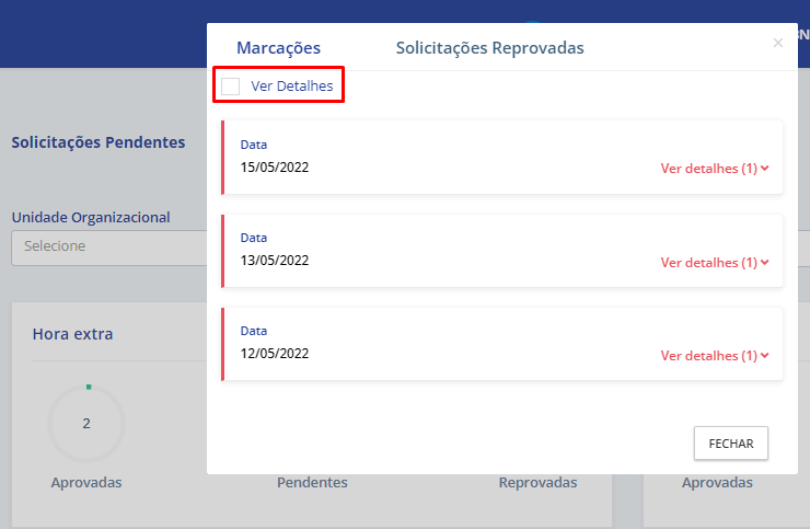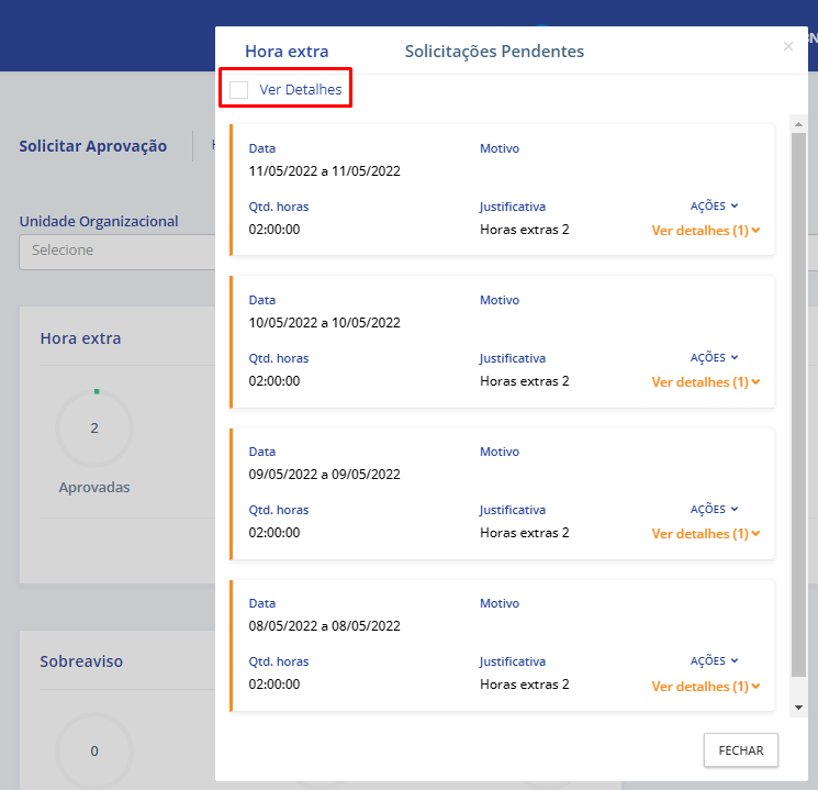 Foi feito uma melhoria nas Solicitações Pendentes e Solicitar Aprovação adicionando uma nova opção Ver Detalhes desta forma será possível ver os detalhes das solicitações sem a necessidade de expandir as solicitações uma a uma.