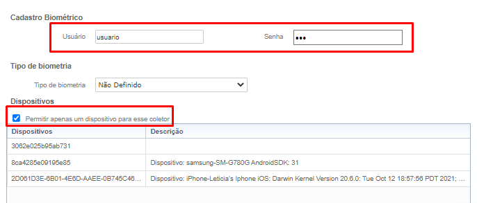 Foi feito uma melhoria no APP NewCollector onde é possível configurar um usuário e senha para acessar o cadastro de Biometria no Aplicativo.