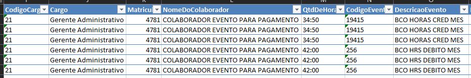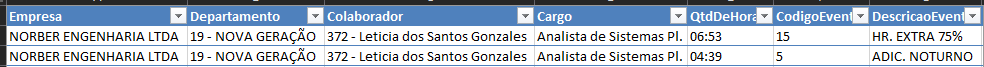 Foi feito uma melhoria no relatório Eventos por Funcionário na exportação Excel para exportar as informações de Código e Descrição separados, ou seja, em colunas separadas no excel.