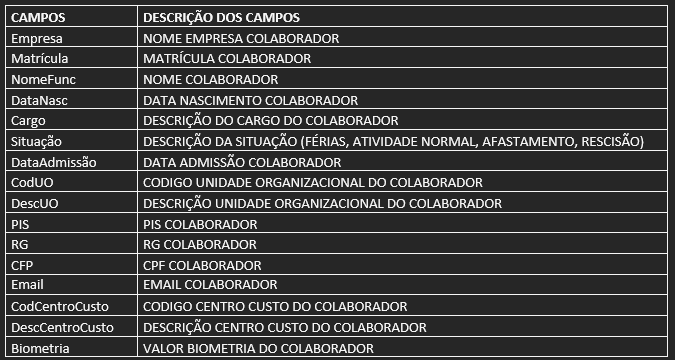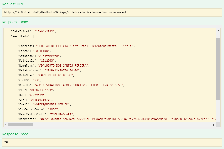 Foi desenvolvido uma nova API chamada retorna-funcionarios-mtr onde retorna os dados cadastrais dos Colaboradores incluíndo a Biometria de acordo com os parâmetros informados na requisição do método.