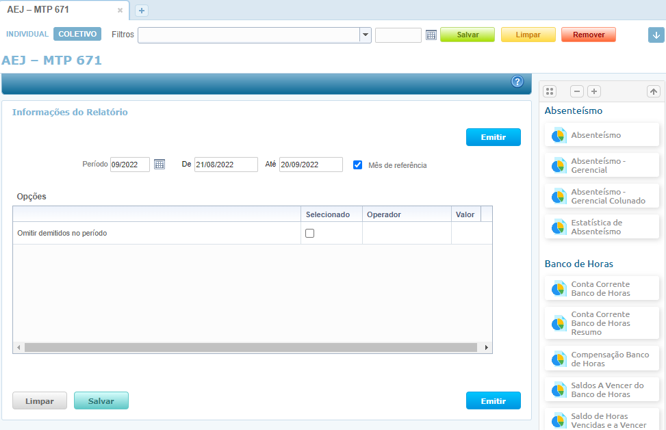 Foi desenvolvido um novo relatório denominado como AEJ , a fim de atender a nova portaria. As informações devem seguir o layout disponibilizado pela MTP 671.