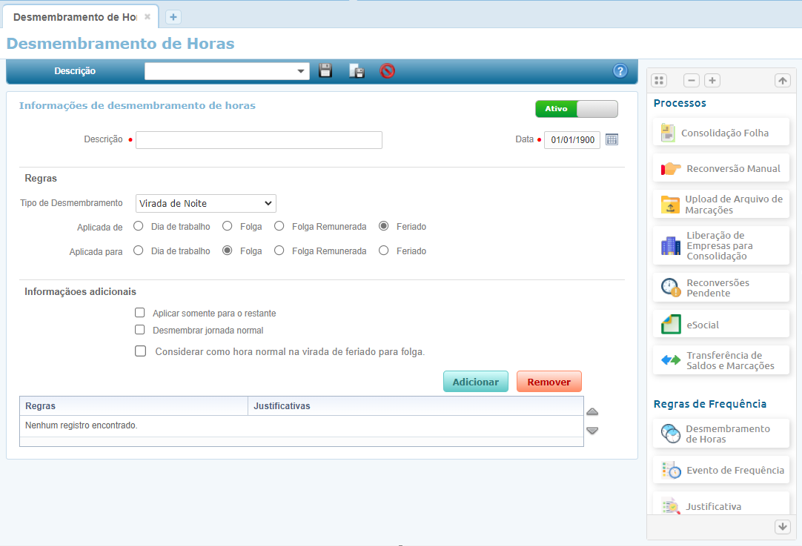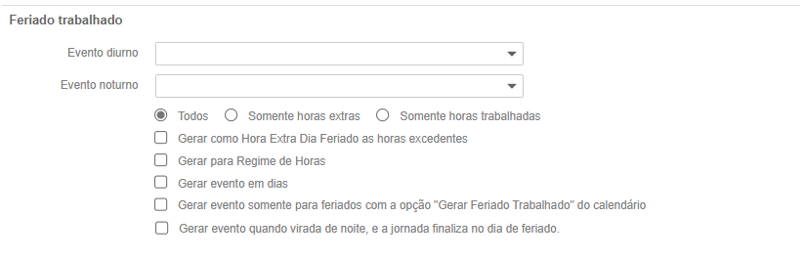 Foi desenvolvido uma nova rotina, onde para que seja gerada hora extra somente durante o período da jornada que o funcionário trabalhou efetivamente no dia físico do feriado. Fora do feriado a jornada deve ser gerada como horas normais de trabalho, mesmo que o dia físico da outra parte da jornada seja uma folga.