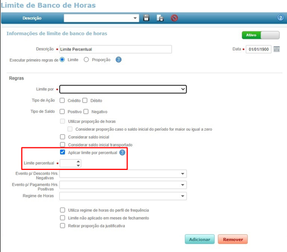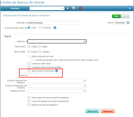 Novo campo para informar a quantidade percentual relacionada ao limite do banco de horas: