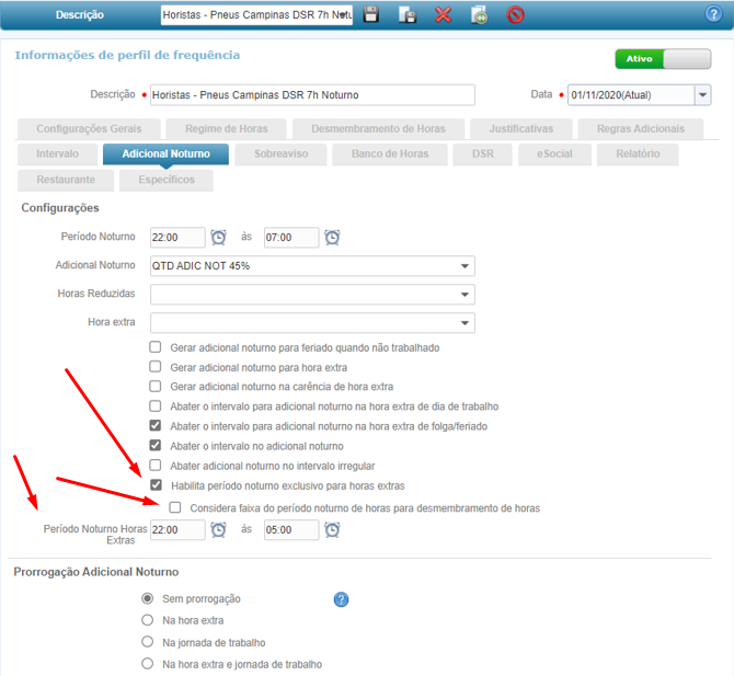 Novas opções no perfil de frequência para faixa do período noturno em horas extras: