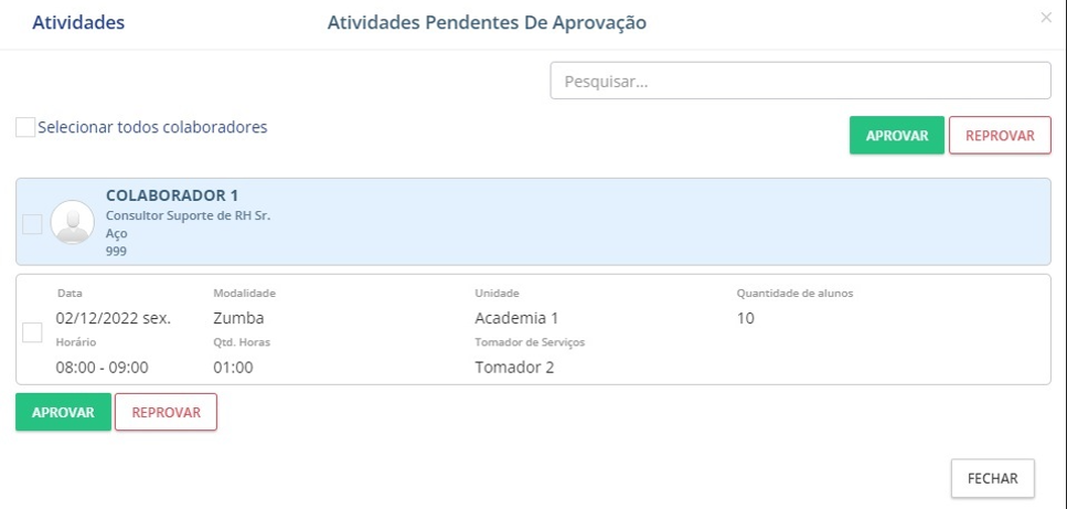 Novo modal Atividades pendentes de aprovação: