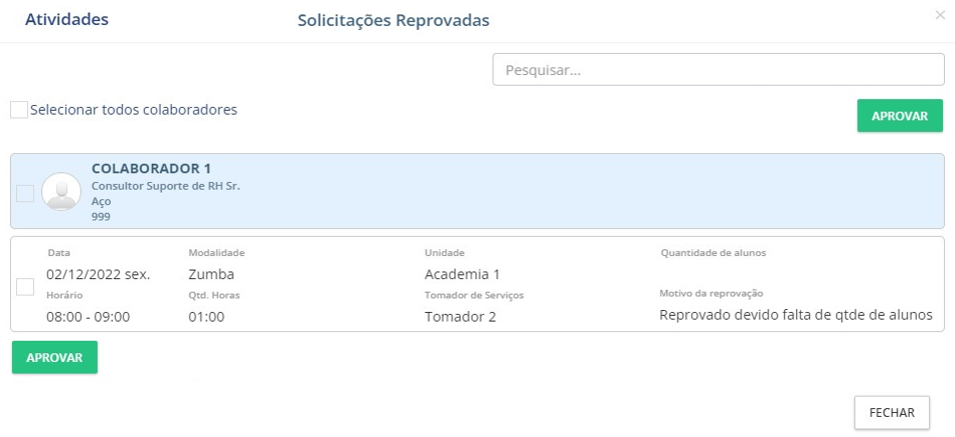 Evidência da atividade reprovada na visão do funcionário:
