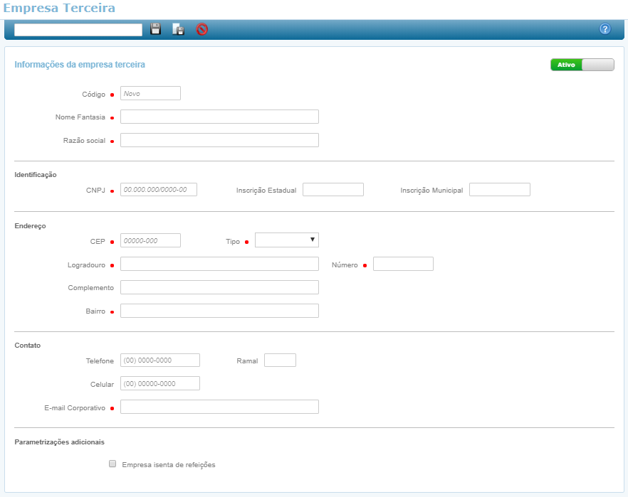 Esta funcionalidade será utilizada para cadastrar Empresas Terceiras e determinar se a empresa será isenta ou não das refeições do restaurante.