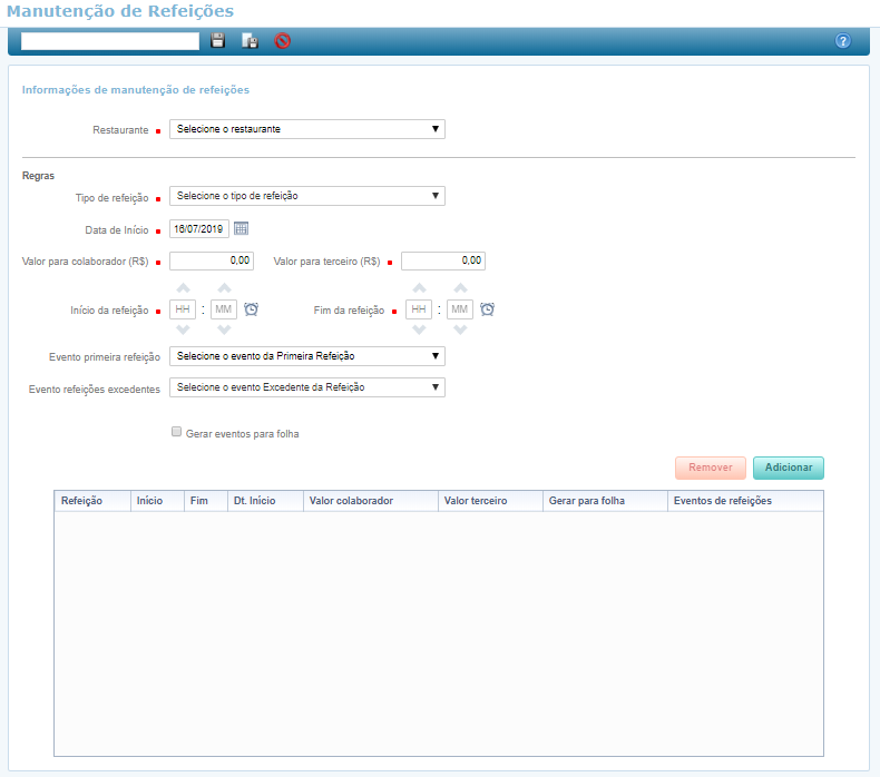 O campo Gerar eventos para folha será consumido no momento da consolidação, determinando se a refeição será calculada na folha ou não. Os eventos das refeições são vinculados na funcionalidade Valores das Refeições.