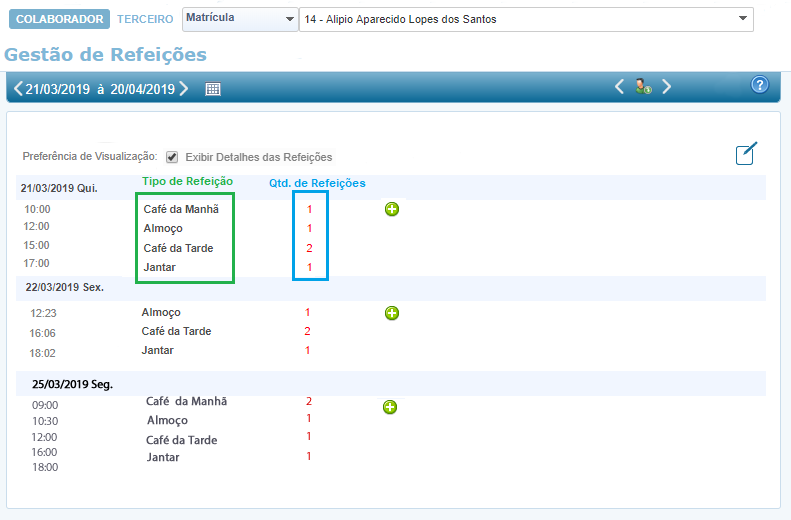 Para cada dia será apresentada as marcações realizadas, sendo opcional apresentar os detalhes das refeições realizadas. Para os detalhes das refeições será apresentado a descrição da refeição realizada e a quantidade de cada refeição.