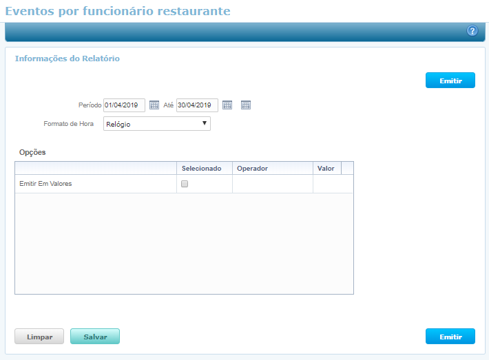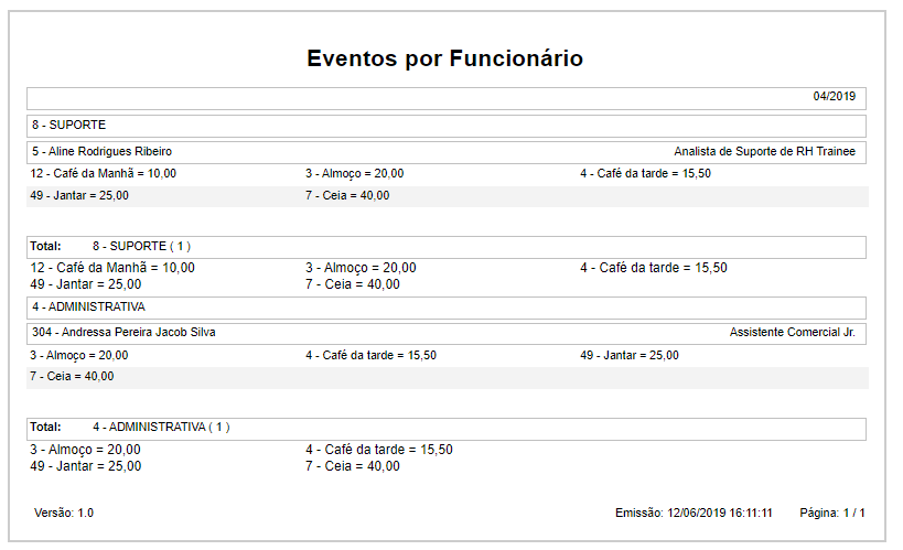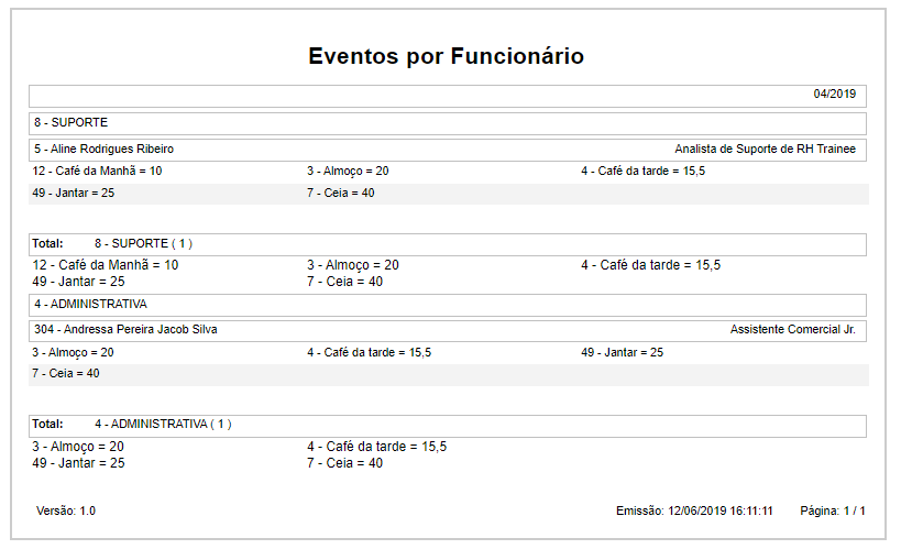 Esta funcionalidade será utilizada para emitir relatório de Eventos por Funcionário, onde será possível visualizar os eventos (refeições) feitas pelo funcionário.