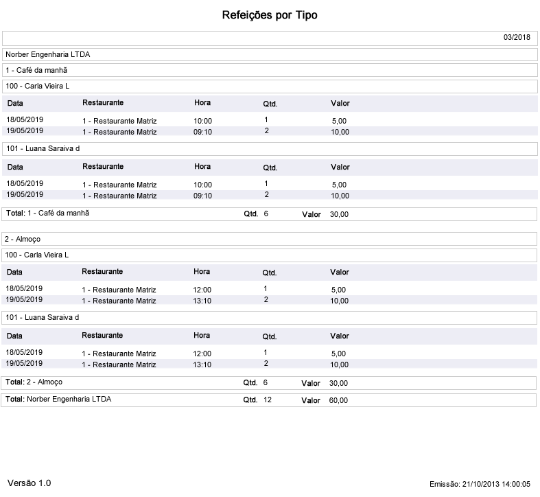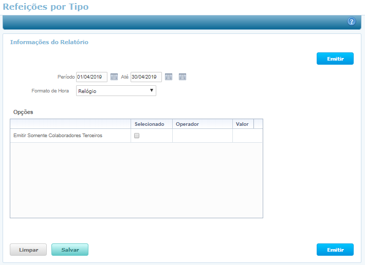 Esta funcionalidade será utilizada para emitir relatório de Refeições por Tipo, onde será possível consultar as refeições realizadas por todos os colaboradores e terceiros.